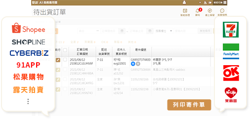 各大電商平台訂單一鍵匯入,出貨速度+ 管理效率+ 買家好評+